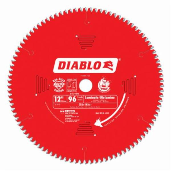 Diablo® Circular Saw Blade, 12 in Dia, 0.071 in Thickness, 1 in Arbor, TCG Teeth, 96 Teeth, 7000 rpm Maximum, 4 in Cutting Depth, 0.091 in Kerf, Carbide Cutting Edge, Applicable Materials: Brass, Aluminum, Copper, Plastic, Laminate Flooring, Melamine and Wood