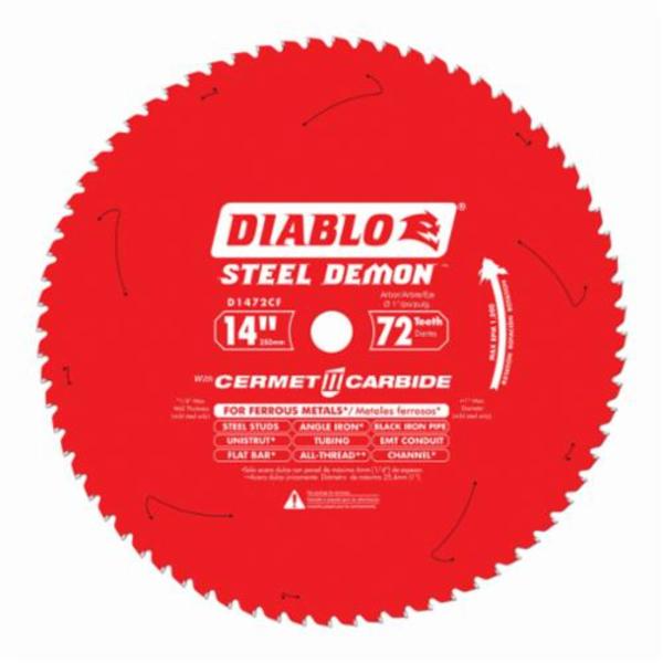 Diablo® Circular Saw Blade, Series: Steel Demon®, 14 in Dia, 0.071 in Thickness, 1 in Arbor, TCG Teeth, 72 Teeth, 0 deg Tooth Angle, 1800 rpm Maximum, 0.083 in Kerf, Cermet Cutting Edge, Carbide Blade, Perma-SHIELD® Coated, Applicable Materials: Steel, Stainless Steel, Iron