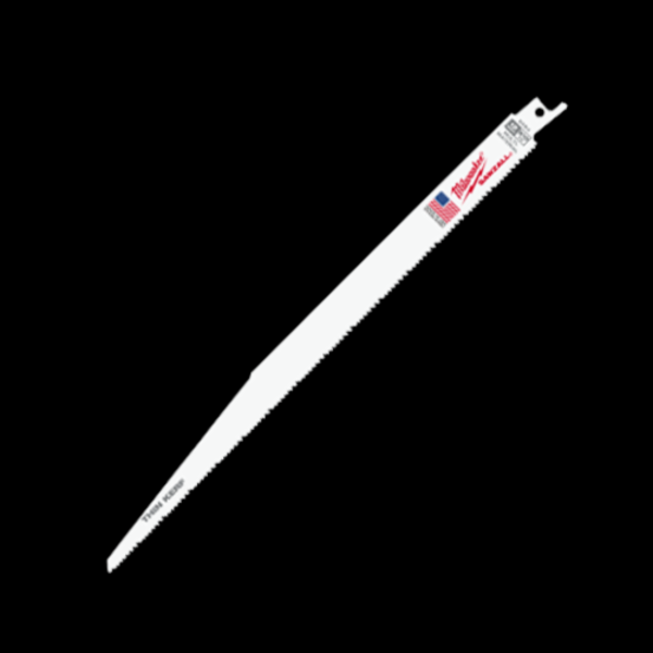 Milwaukee® Reciprocating Saw Blade, Straight Back Thin Kerf, Series: Sawzall®, 12 in Length, 3/4 in Width, 0.05 in Thickness, 8/12, Matrix II Teeth, 1/2 Tang, Universal Tang, HSS-Co 8 Cutting Edge, Bi-Metal Body, Bright, Applicable Materials: Cast Iron, Most Metal, Plastic and Wood
