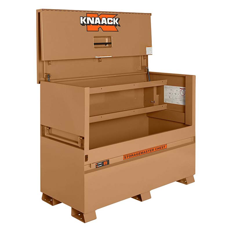 The Model 89 Piano Box provides a complete storage solution for tools, supplies, and other materials. Measuring 60 inches wide by 78 inches high when open (49 inches when closed), this job box offers 47.8 cubic feet of storage for all trades. Full-width interior shelves enable you to organize and protect tools, and the bi-fold cover opens upwards and folds completely out of the way for unrestricted access. A tan, powder-coat finish provides durable protection against corrosion, while a heavy-duty piano hinge protects against pry-ins and theft. A Watchman IV Lock System aids further in the-foot protection, featuring recessed, 7-gauge lock housing. Handles are also recessed to avoid damage during transit. Run power to the interior of the box with a grommeted, weatherproof Power Pass Electrical Pass-Thru. Gas spring guards prevent damage from shifting loads during transport. This workhorse features an improved ball stud bracket for added strength and greater durability.It also comes with 3 KNAACK Padlocks that fit perfectly in the lock box .