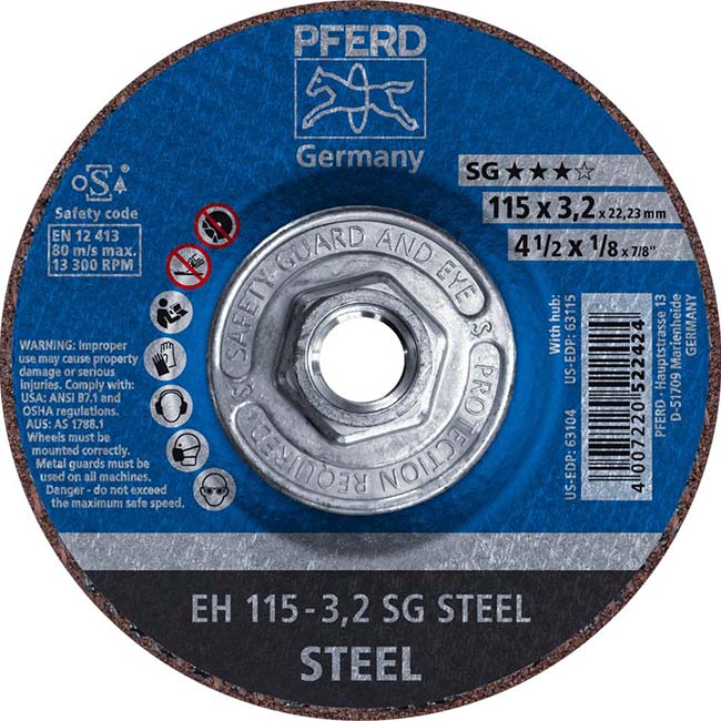 PFERD Cut-Off Wheel, Depressed Center, Series: Performance Line SG, 4-1/2 in Wheel Dia, 1/8 in Wheel Thickness, 46 Grit, Medium Grade, Aluminum Oxide Abrasive, 13300 rpm Maximum, Resin Bond, Applicable Materials: Steel and Cast Iron, 5/8-11 Center Hole Thread Size, Wheel Type Number: Type 27, Wheel Hardness: S, For Use With: Angle Grinders, Yes Reinforced