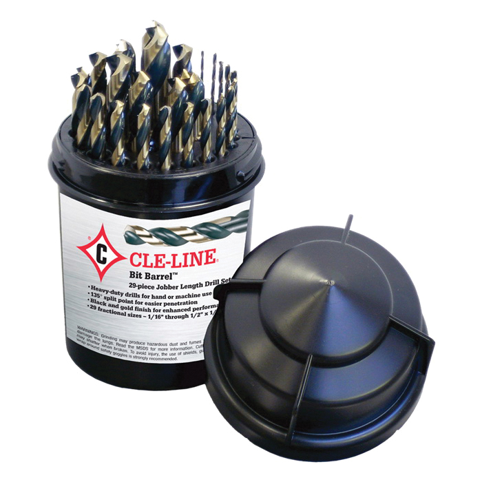 Cle-Line® Mechanics Length Drill Set, Heavy Duty, Series: 1875R, Imperial System of Measurement, 1/16 in Minimum Drill Bit Size, 1/2 in Maximum Drill Bit Size, 135 deg Drill Point Angle, 29 Piece, Specifications: Right Hand Cut, Spiral Flute, Split Point, Straight Shank, HSS, Black/Gold