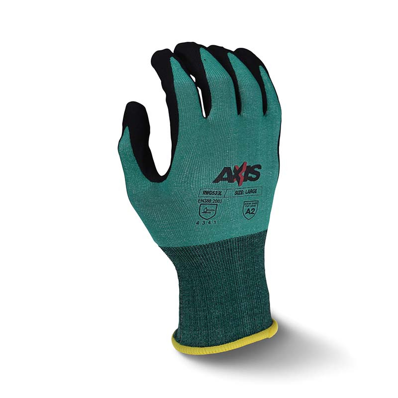 The RWG533, an Axis™ Series glove by Radians®, has an ANSI cut rating of A2 and an EN388 cut rating of 3. The RWG533 glove features an 18 ga, green HPPE shell to provide significant protection against abrasion and cuts. It's often used in work environments with sharp objects, like HVAC, construction and manufacturing.