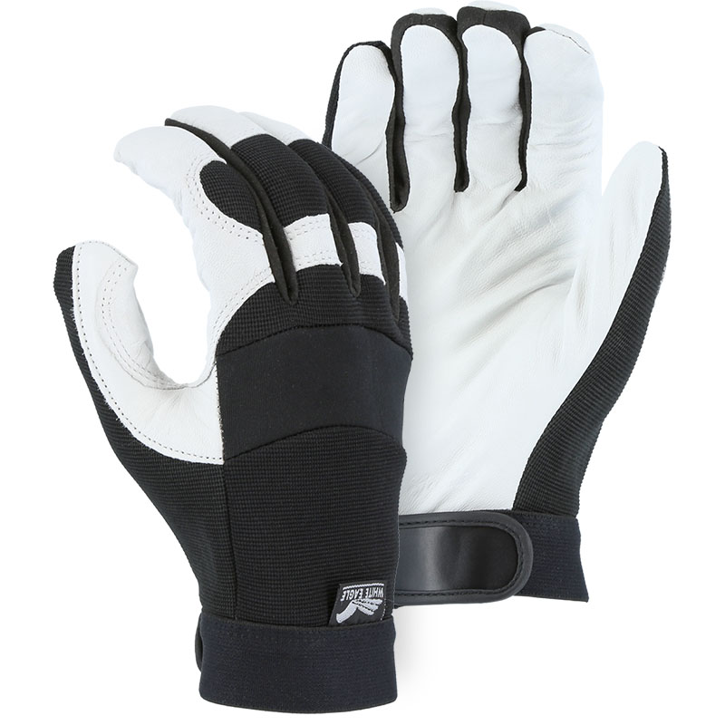 Majestic Glove White Eagle 2153/9 General Purpose Gloves, Mechanics, M/SZ 9, Grain Goatskin Leather Palm, Grain Goatskin Leather/Stretch Knit with Neoprene Knuckle, Black/White, Elastic Wrist Cuff, Unlined Lining, Pre-Curved Finger