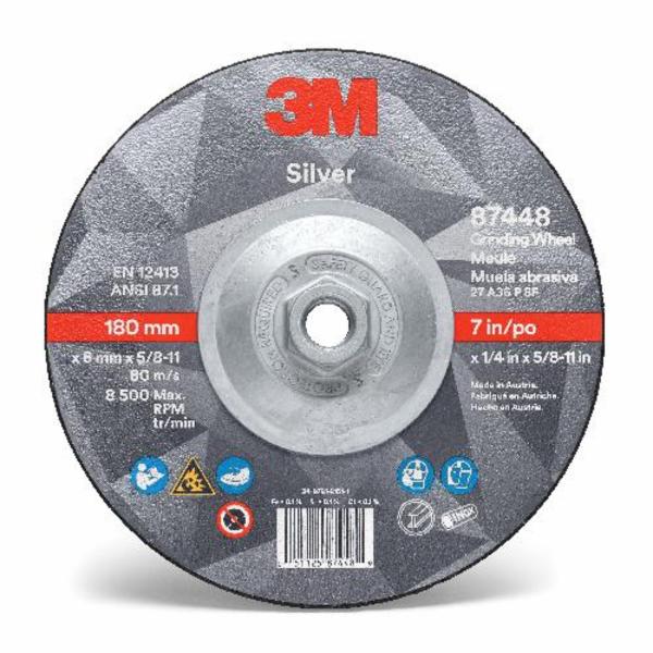 3M™ Depressed Center Wheel, Series: Silver, 7 in Wheel Dia, 1/4 in Wheel Thickness, Threaded/Quick-Change Connector, 36 Grit, Ceramic Grain Abrasive, Wheel Type Number: Type 27, 8500 rpm Maximum, Resin Bond, Applicable Materials: All Metals, Carbon Steel, Cast Iron, High Speed Steel, Non-Ferrous Metals, Stainless Steel, Steel and Tool Steel, 5/8-11 Center Hole Thread Size, Black Wheel, Yes Reinforced, ANSI B7.1 Specifications Met