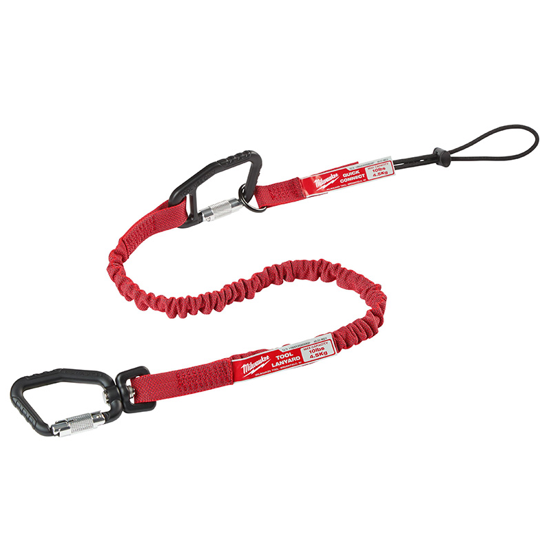 Milwaukee® 10 lb. Quick-connect locking tool lanyard helps users stay safe and stay productive while working at heights by reducing the risks associated with dropped tools. Featuring a carabiner on both ends for fast swaps between tools. The lanyard body is engineered to provide the best shock absorption, slowing the tool gradually if a drop occurs. Locking carabiners require double actions to open, ensuring a secure connection. Integrated swivel reduces twists when rotating tools. Integrated swiveling carabiner reduces twists when using tools. The red color coded lanyard allows the user to easily identify the lanyard's weight rating. Use with Milwaukee® quick-connect accessories for maximum productivity. For use with tools up to ten pounds.