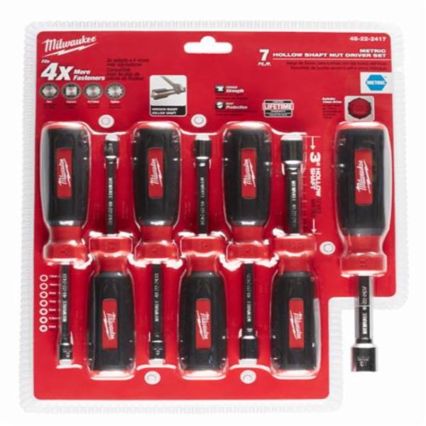 Milwaukee® 7-piece SAE hollow shaft nut drivers feature universal driver heads which fit 4X more fasteners including square, hex, 12 point and spline. Designed for maximum durability the Wrench Ready™ hex steel shanks are forged and chrome plated. Milwaukee® nut drivers are designed for the jobsite and include Milwaukee® limited lifetime warranty.