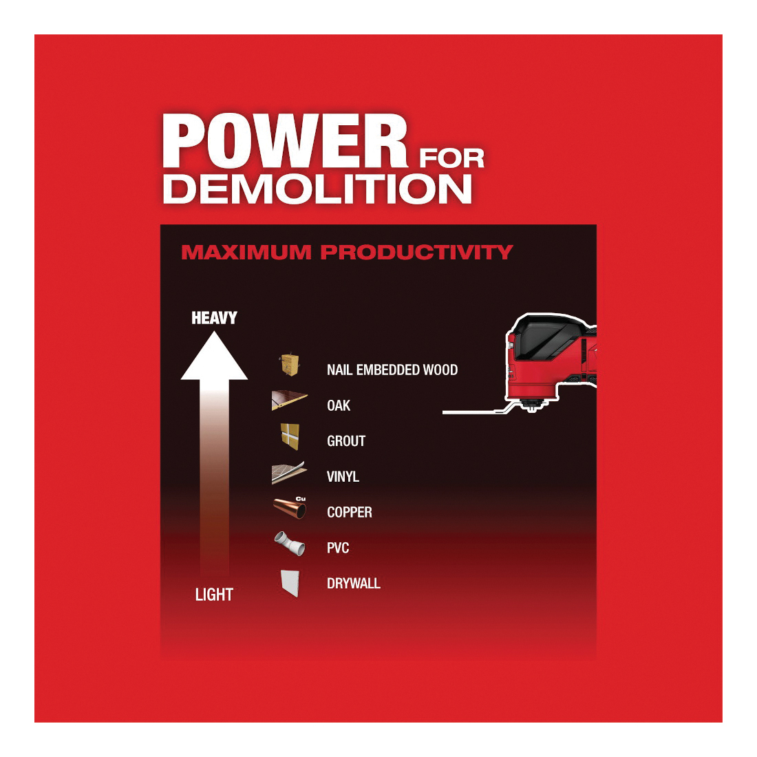 The MILWAUKEE® M18 FUEL™ Oscillating Multi-Tool generates the fastest cuts, the power for demolition, and the lowest full tool vibration. The POWERSTATE™ Brushless Motor delivers 10,000 to 20,000 OPM with an aggressive 4.2-degree oscillation angle to deliver the fastest cuts over the competition. The cordless multi-tool also delivers the power to complete many demanding applications with ease, such as large cuts through hardwoods and nail embedded wood, pushing the limits of what a multipurpose oscillating tool can do. Vibration dampening technology delivers the lowest full tool vibration, making cuts more comfortably with less fatigue. REDLINK PLUS™ Intelligence achieves unmatched levels of performance, protection, and compatibility. The M18™ REDLITHIUM™ XC5.0 battery (not included) delivers more work per charge than competitive batteries on the market when used with the multitool. The M18 FUEL™ Oscillating Multi-Tool has a 10-Setting Dial with an additional Auto-Load Feature, allowing users to adjust the speed to the application. An integrated 180-degree LED light provides maximum visibility in low-light situations.