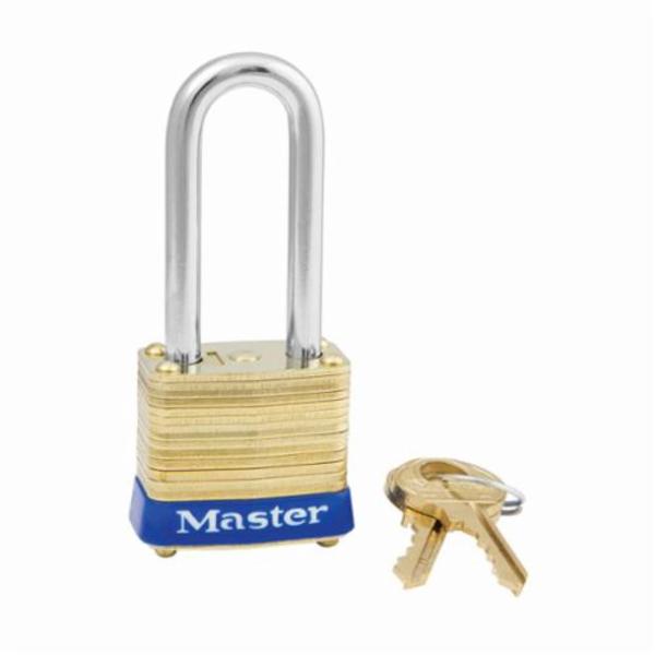 Master Lock® Safety Padlock, Non-Rekeyable Rectangular, Keyed Different Key, Laminated Brass Body, 3/16 in Shackle Diameter, 1-1/2 in Shackle Height, 1/2 in Shackle Width, Steel Shackle, 1-1/8 in Body Width, 1-1/8 in Body Height, 1/2 in Body Thickness, Dual Locking Lever/4-Pin Tumbler Cylindrical Locking Mechanism, Brass, 1 Bumpers