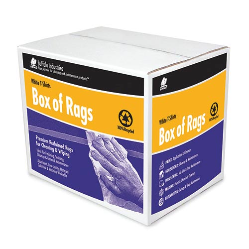 5 LB box of colored t-shirt rags from Buffalo Industries. Made from 100% recycled materials, cloth rags are economical, more durable than paper and cut in useable-sized pieces. Colored cloth rags are ideal for general cleaning, paint spills and cleanup, staining and varnishing, polishing and dusting.