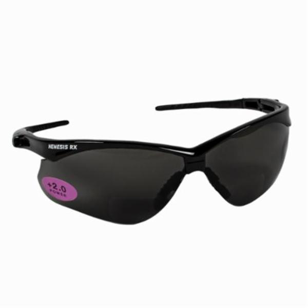 Jackson Safety* Reader Safety Glasses, Bi-Focal Lens, Series: V60 Nemesis* RX™, 1.5 Diopter, Universal Size, Hard Coat/Impact/Scratch Resistant Lens Coating, Smoke Lens, Half Framed/Wraparound Frame, Black Frame, Nylon Frame, Polycarbonate Lens, 99.9% UVA/UVB/UVC UV Protection, Flexible Ratchet Temple, Specifications Met: ANSI/ISEA Z87.1+2010, CSA Certified, TAA Compliant