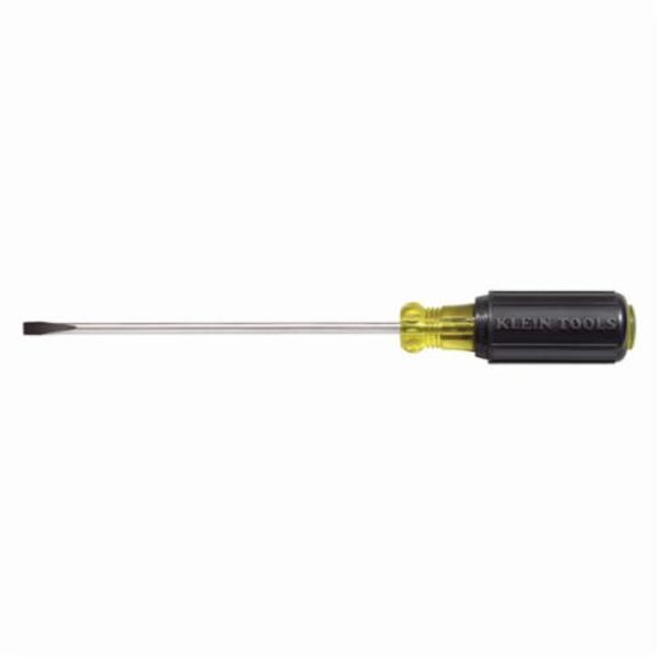 Klein® Screwdriver, Measurement System: Imperial, Cabinet Point, 3/16 in Point, 6-3/4 in Overall Length, Round Shank, 3 in Shank Length, Steel Shank, ANSI/ASME Specified Specifications Met, Insulated: No, No Magnetized Tip, No ESD-Safe, Cushion Grip Handle, Rubber Handle, Steel, Chrome Plated/Black Tipped, Yellow/Black