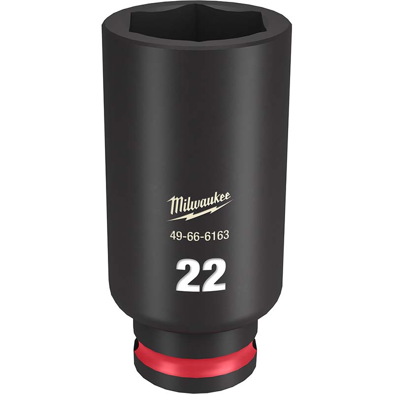 The Milwaukee® SHOCKWAVE™ Impact Duty™ 3/8 in Drive 22 mm Deep 6-Point Socket features the boldest, longest-lasting markings and extreme impact durability in high torque applications. The stamped and ink-filled size marking enables an accurate socket selection every time throughout the life of the socket. Engineered with high-strength forged steel for optimized performance in heavy-duty applications and a non-slip hex geometry prevents fastener rounding. The dual-hole design and ring groove allow for easy socket attachment and removal. All SHOCKWAVE™ Impact Duty™ Sockets are backed by a Lifetime Guarantee and meet ASME industry standards.