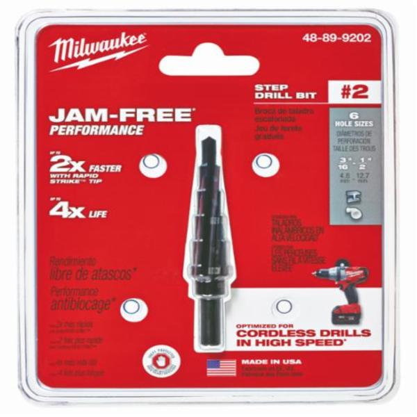 Milwaukee® Step Drill Bits with JAM-FREE Performance feature a dual-flute design delivering up to 2X faster hole times, up to 4x longer life and up to 50% more holes per battery charge than competitors. Ideal for drilling small and large-diameter holes in steel and plastic, these bits are Optimized for Cordless Drills in High Speed. The Rapid Strike™ tip allows for a fast and accurate start that generates less heat, resulting in longer bit tip life. Black oxide coating also enhances durability, hole quality and bit life. For user convenience and accuracy, each bit has laser-engraved reference marks you can see while drilling. The 3-flat Secure-Grip™ shank ensures a solid connection with the drill chuck. The NO 2 Step Drill Bit has 6 hole sizes in 1/16 in increments ranging from 3/16 to 1/2 in JAM-FREE Performance in high speed with most professional 18 V cordless drills with lithium-ion battery technology.