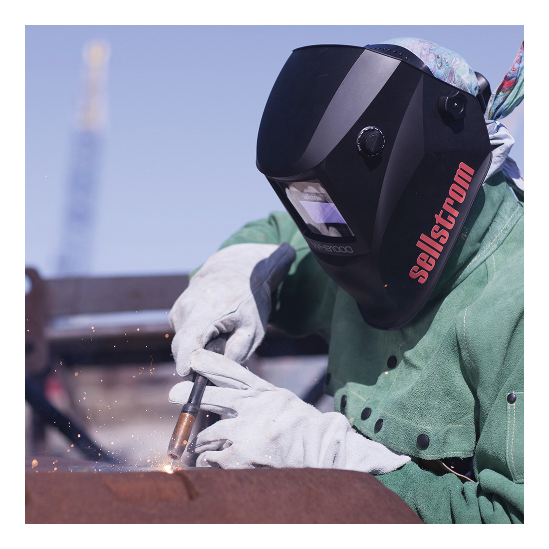 sellstrom® Welding Helmet, Lightweight Fixed Front, Series: Advantage, 9 to 13 Lens Shade, Black/Red, 3.54 x 1.57 in Viewing Area, Ratchet Headgear, Nylon, Solar Power Source, Specifications Met: ANSI Z87.1, CAN/CSA Z94.3, CE Certified