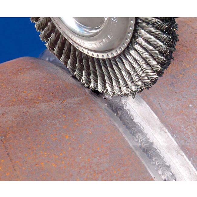 Stringer Bead/Twist Knot Wire Wheel Brush, 4" Dia x 3/16" W, 5/8"-11 Arbor, 0.02" Carbon Steel Wire